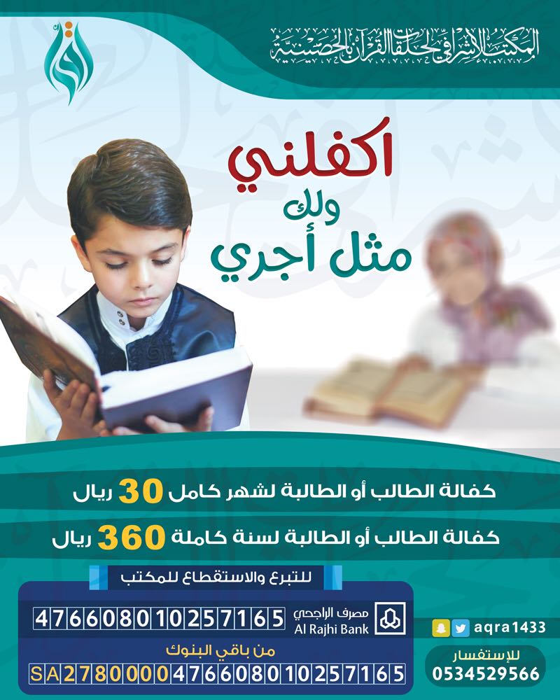 بسم الله الرحمن الرحيمقال الشيخ ابن عثيمين يرحمه الله تعالى (الذي يدفع ماله لتعليم القرآن هو في الحقيقة معلم للقرآن)المشروع تابع للمكتب الإشرافي لحلقات القرآن بالحصينيةاكفل طالب أو طالبة تحفيظ لشهر كامل ب 30 ريال فقط ليكون لك مثل أجرهم وتلاوتهم القرآن آناء الليل والنهارأو أكفل طالب أو طالبة تحفيظ لمدة سنة كاملة ب 360 ريال فقط ليكون لك مثل أجور تلاوتهم القرآن طوال السنةوأنت في فراشك بإذن الله تأتيك أجور طالب يتلو ويحفظ القرآن ويردده ليل نهار وأنت مرتاح في مكانك فأين المشمر وأين من يقتنص الفرص